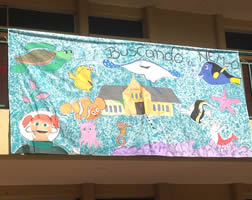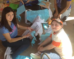 | Profesoras y alumnas de la alianza "Buscando a Nemo" en el desafío de baile. | Alumnas de "Buscando a Nemo" trabajando en la elaboración del tiburón, la mascota de la alianza, hecho en base a material reciclado. | |