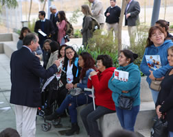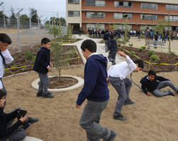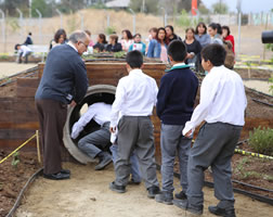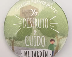 | El túnel, otro de los grandes atractivos para jugar en el patio (Crédito de foto: Fundación Cosmos) | Discurso inaugural de Miguel Arce, director del Colegio PuenteMaipo. | Chapita "Yo Disfruto y Cuido Mi Jardín" que Fundación Cosmos regalóa todos los alumnos de PuenteMaipo como recuerdo |