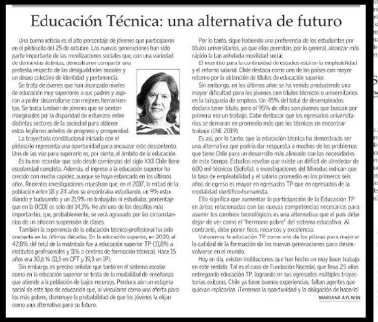 Una columna de opinión sobre la importancia de la Educación Técnico Profesional, escrita por la ex Ministra de Educación, Mariana Aylwin, fue publicada el viernes 11 de diciembre en el diario El Mercurio.